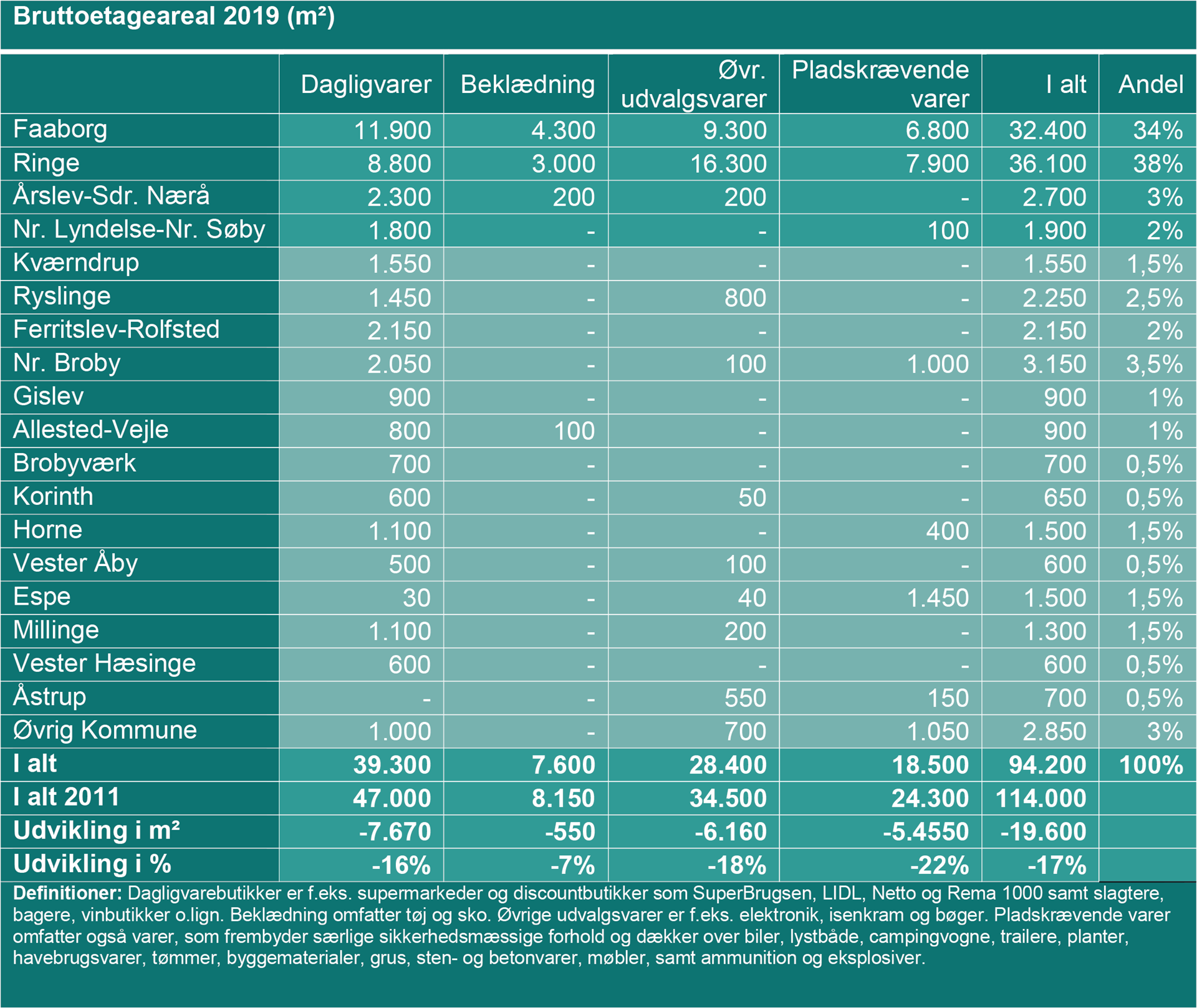 I tråd med, at der er forsvundet et betydeligt antal butikker i perioden 2011-2019, har Faaborg-Midtfyn Kommune mistet knap 20.000 m² bruttoetageareal svarende til 17 %.