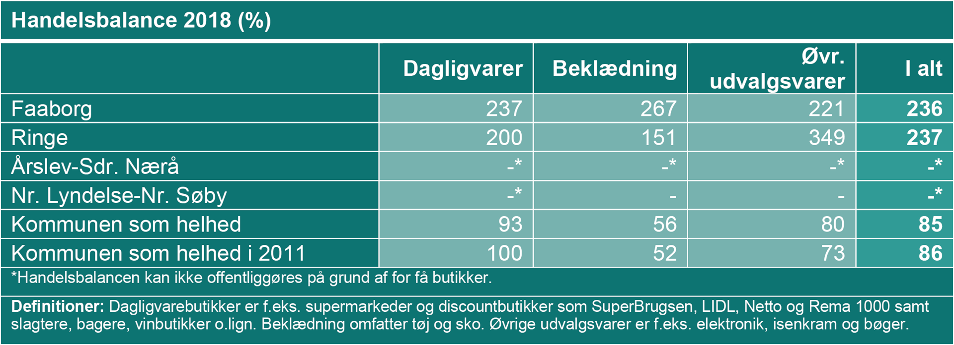 I Faaborg by er den samlede handelsbalance steget fra 225 % i 2011 til 236 % i 2018, hvilket viser, at Faaborg har erobret markedsandele. Stigningen er fordelt på en vækst inden for dagligvarer på 12 %-point og handelsbalancen for på 35 %-point inden for beklædning, mens handelsbalancen er på samme niveau for øvrige udvalgsvarer. Handelsbalancen på 236 % viser også, at Faaborg har en stor rolle som hovedby for handel, der dækker et større opland i den sydlige del af kommunen og er indkøbsby for turister i området.