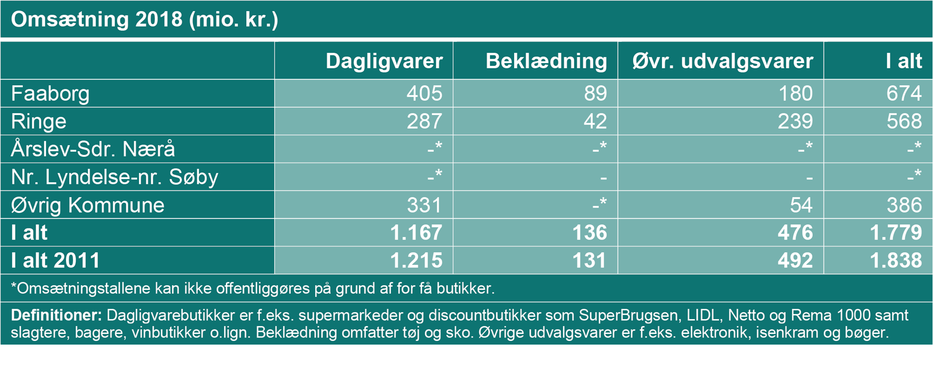 Butikkerne i Faaborg-Midtfyn Kommune omsatte for ca. 1,8 mia. kr. i 2018 ekskl. bilforhandlere, som står for yderligere ca. 340 mio. kr. Omsætningen er ca. 60 mio. kr. eller 3 % mindre end i 2011. Omsætningen er steget med 1,5 % i Faaborg og 4,2 % i Ringe. Set på brancher har dagligvarer og øvrige udvalgsvarer tabt omsætning, mens der har været fremgang inden for beklædning.