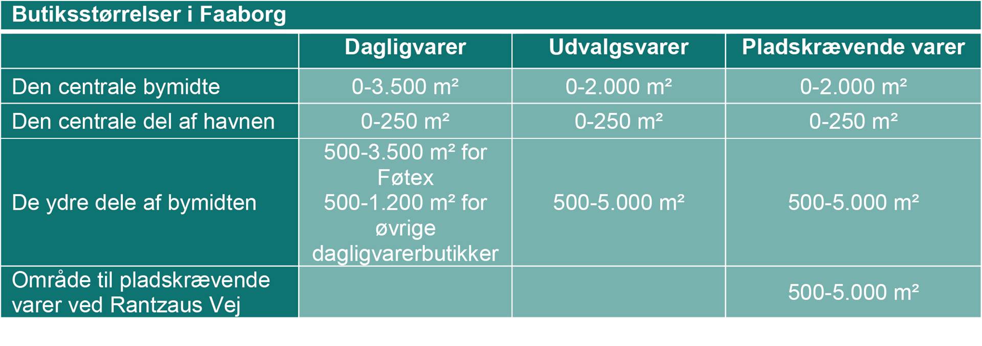 Nye dagligvarebutikker skal derfor placeres i eller i kanten af den centrale bymidte, så det bidrager til at styrke den samlede handel i Faaborg. Uden for den centrale bymidte må antallet af dagligvarebutikker ikke øges, men der må gerne bygges en ny, hvis en eksisterende lukkes.
