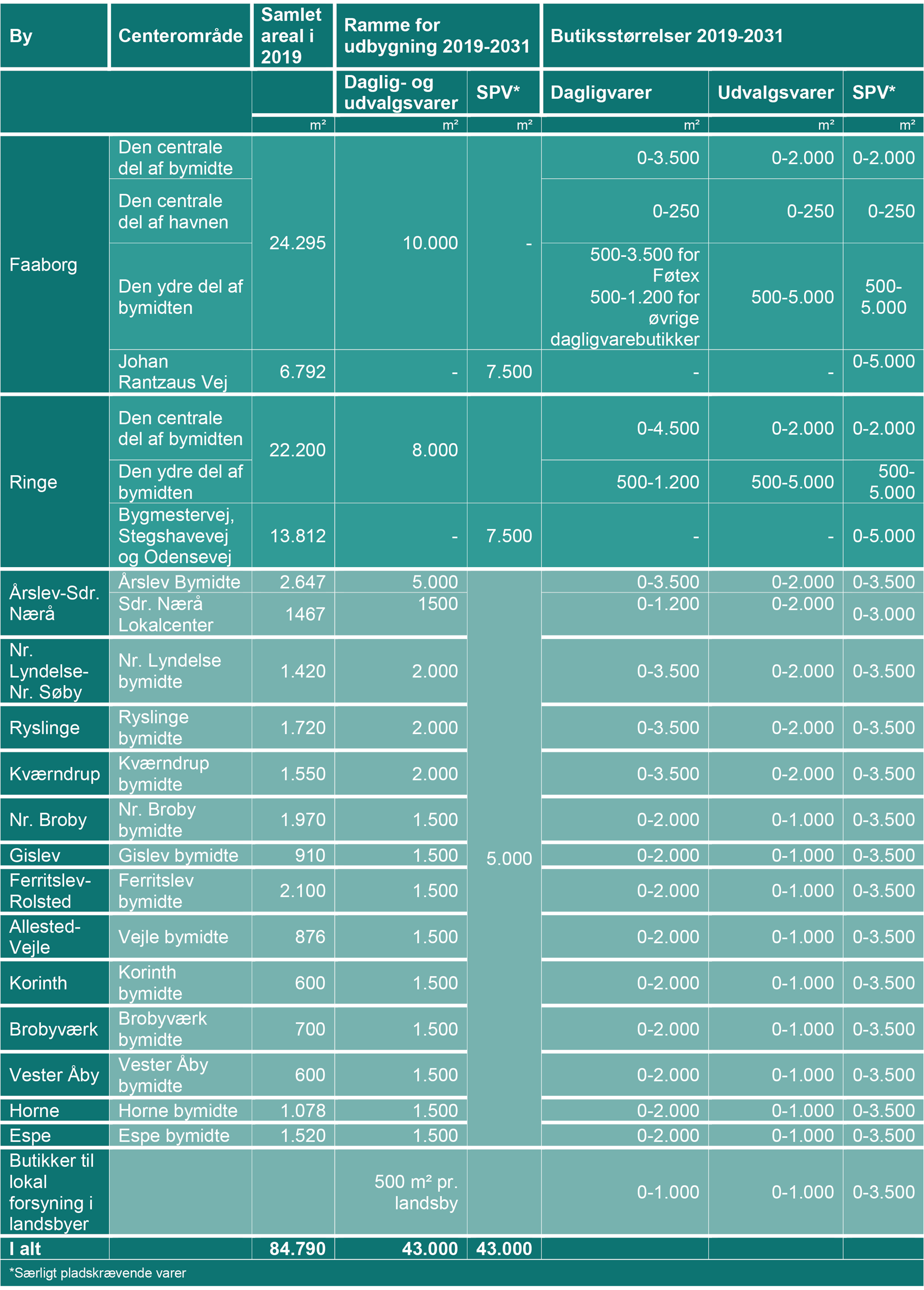 I de enkelte områder til detailhandel fastlægges rammer for det samlede bruttoetageareal til butikker samt maksimale størrelser for disse, se skemaet nedenfor. Inden for de enkelte områder vil de maksimale butiksstørrelser blive differentieret i kommuneplanrammerne, så de tilpasses målene for detailhandlen i den enkelte by, samt hvad der vurderes at være realistisk i det enkelte delområde. Der er eksempelvis i skemaet nedenfor fastsat maksimale størrelser for udvalgsvarebutikker på 5.000 m² i de ydre dele af bymidterne i Faaborg og Ringe for at åbne mulighed for at de to byer kan tage imod de største udvalgsvarebutikker. I rammedelen er de maksimale størrelser på udvalgsvarebutikker typisk 2.000 m². Begrundelsen for at de maksimale størrelser ikke er hævet i rammedelen er, at det vil kræve en særlig planlægning inden det kan afgøres om områderne rent faktisk vil kunne modtage så store butikker.