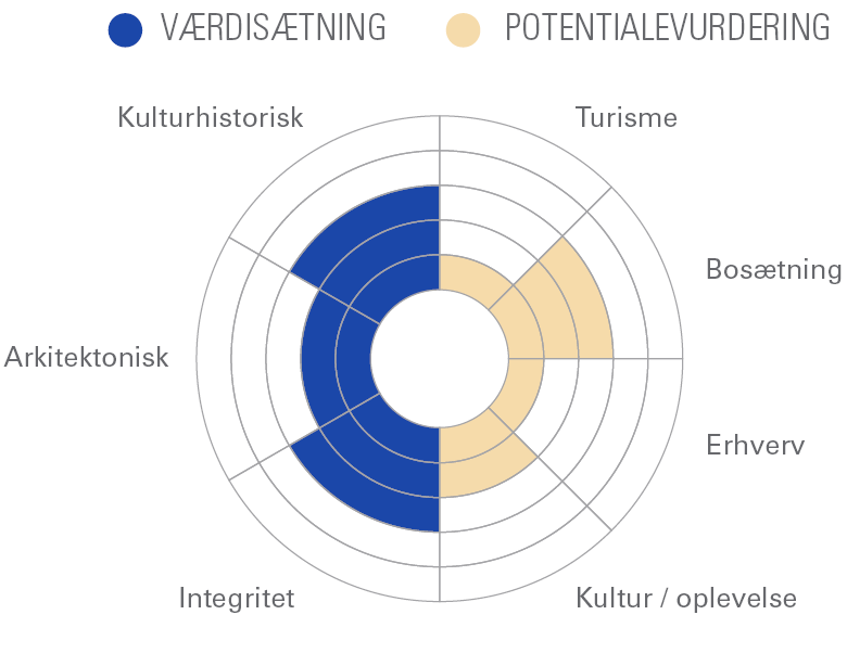 Områdets bygninger bør bevares og fastholdes i deres oprindelige udtryk, og ændringer bør foretages varsomt og med respekt for arkitektur og detaljerigdom.