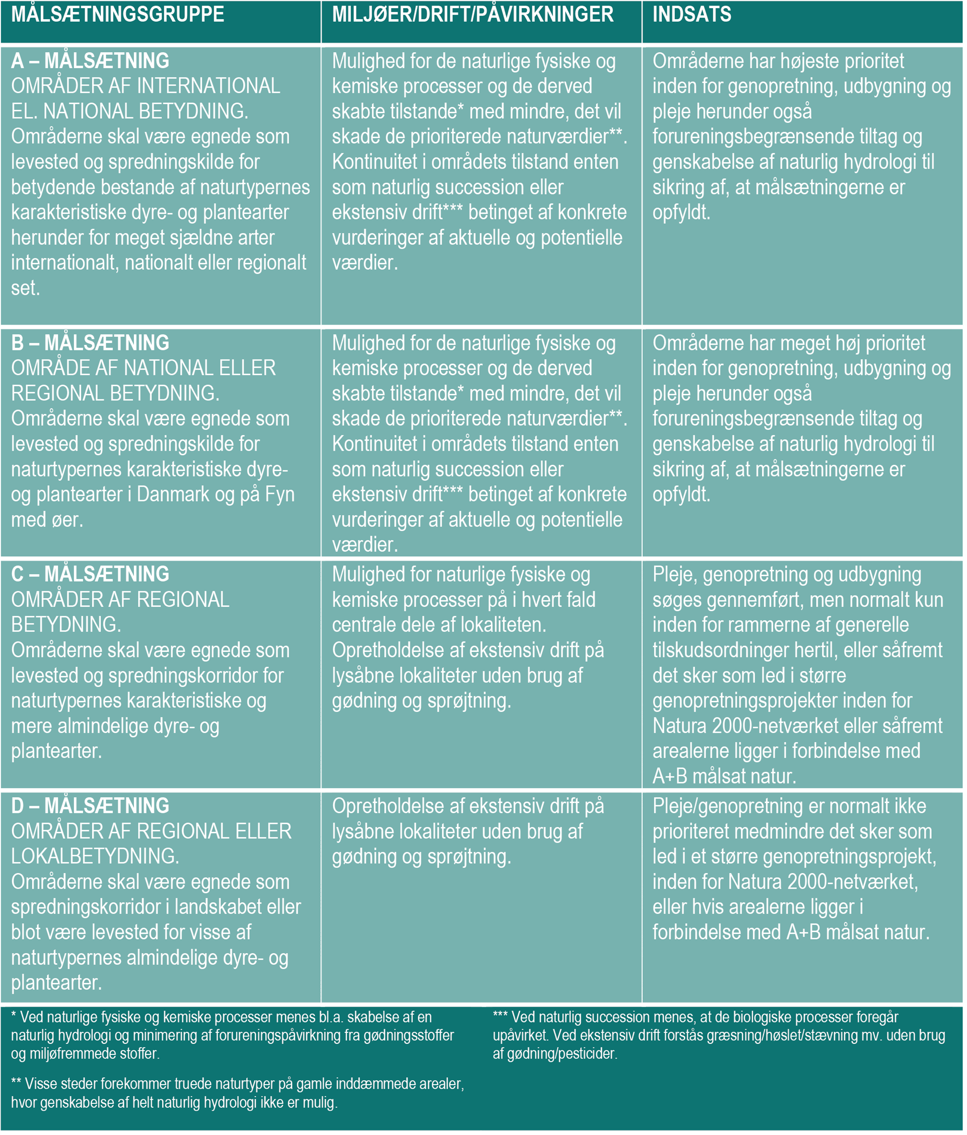 Naturværdierne skal forbedres, og befolkningens oplevelsesmuligheder i og adgang til naturområderne skal øges. De vigtigste arealer skal udvides og om muligt sammenkædes. Benyttelsen af naturen må dog ikke skabe væsentlige forringelser i de værdifulde naturområder.